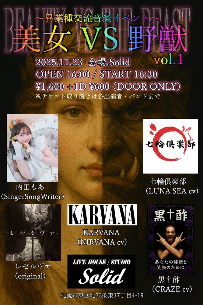 🎤【札幌】美女VS野獣 ライブ/出演情報 2025/11/23(日) 16:00 - Solid 地図を表示 美女VS野獣 ライブ Solid 『美女VS野獣』 2025.11.23(日) OPEN 16:00 START 16:30 会場 Solid (札幌市東区北33条東17丁目4-19) イベントに内田もあの出演が決定! 来場希望の方は watagumoworksマネージャーアカウントにDM、 もしくはメールでも受付しております。 URLをコピーする 報告する
